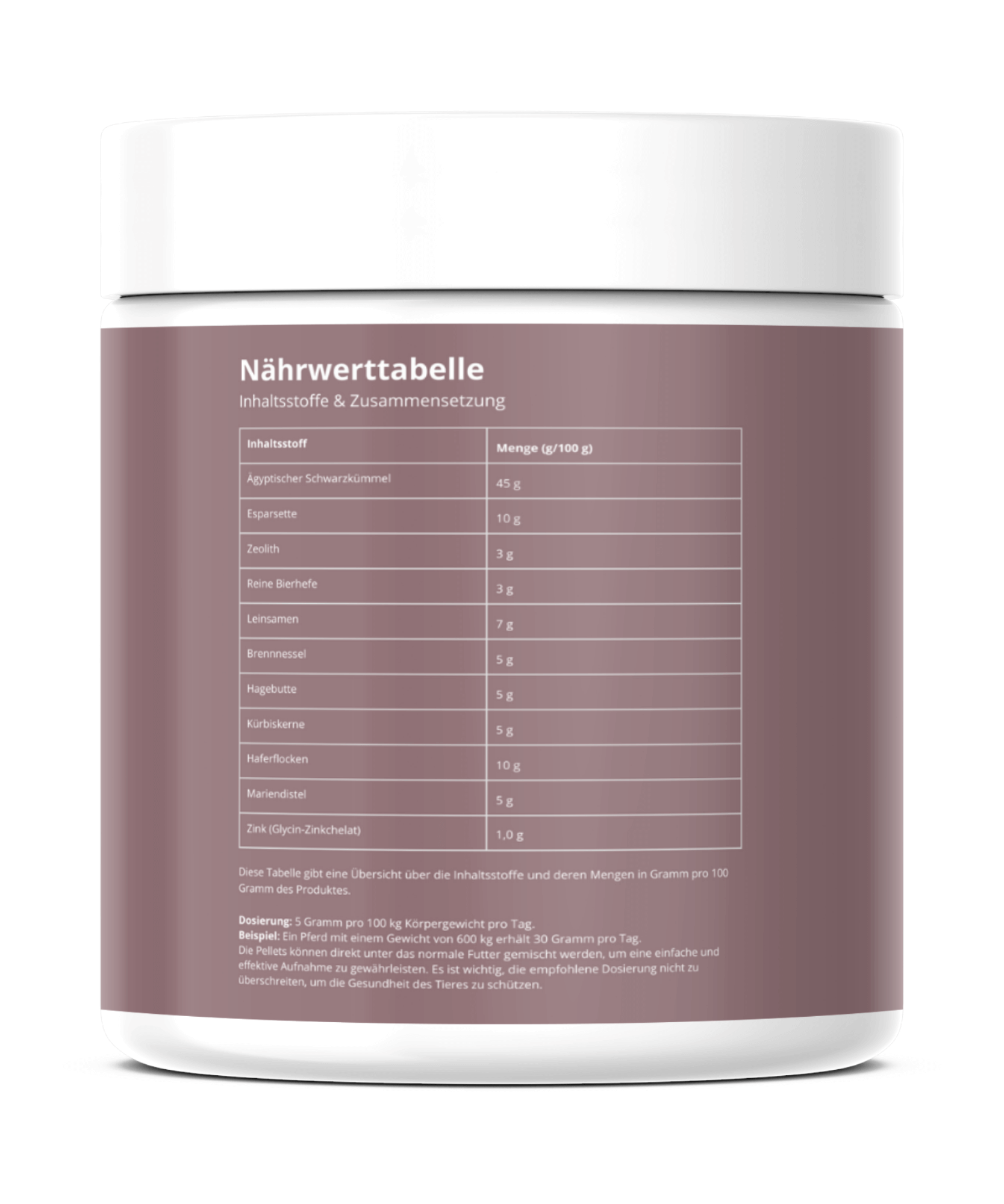 Unsere Zink- und Kräuterpellets vereinen gezielt ausgewählte Inhaltsstoffe, die auf wissenschaftlicher Basis verschiedene Körpersysteme deines Pferdes stärken: